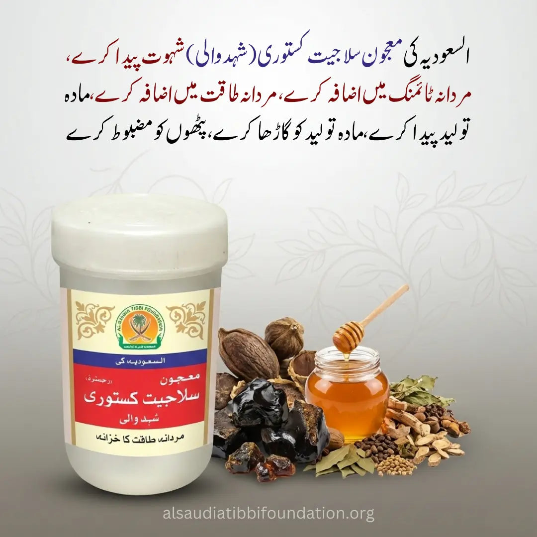 Majoon Salajeet Kasturi by Al-Saudia Tibbi Foundatio is a potent herbal remedy designed to support male fertility and boost mardana taqat. Crafted with pure Salajeet and Kasturi (Musk), this traditional formulation increases seminal fluid thickness, enhances male potency, boosts semen volume, and strengthens muscles. Experience renewed vitality and improved performance naturally with our expertly blended herbal solution.